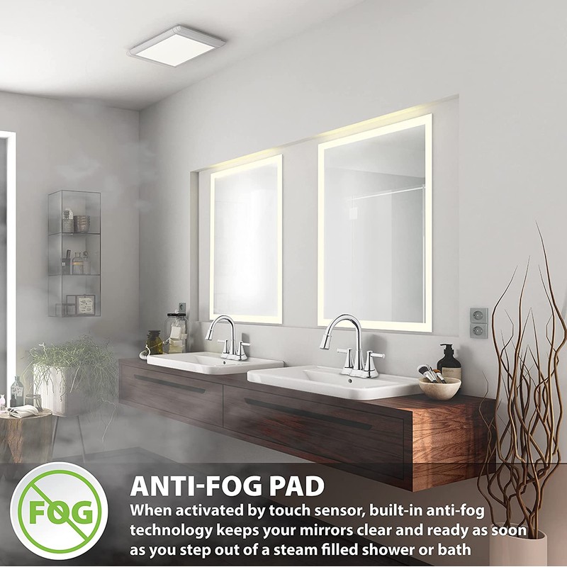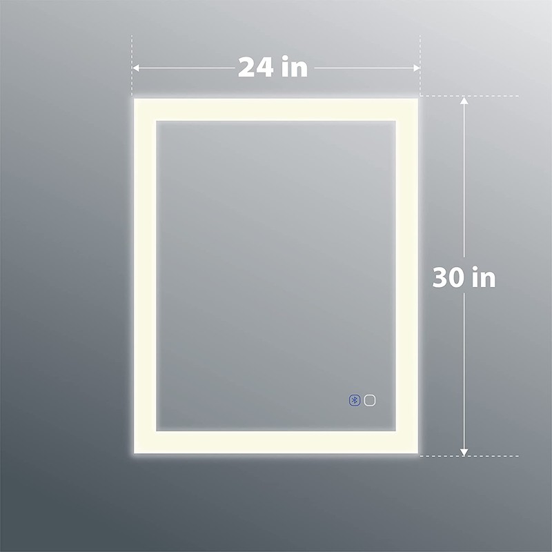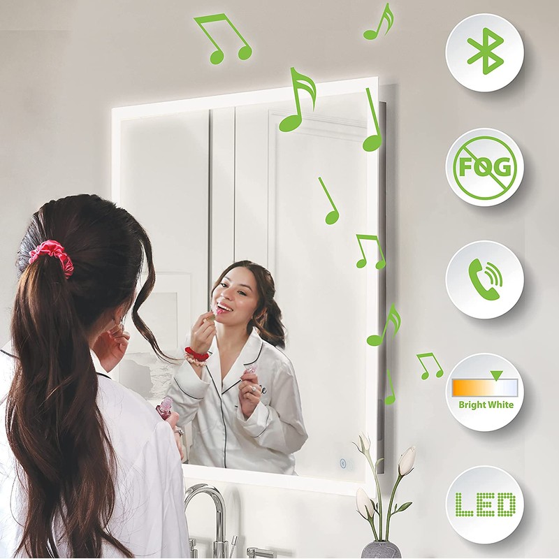 • LED Wall Mirror with Bluetooth Audio: Bluetooth Vanity Mirror includes an innovative dual Bluetooth speaker technology that lets you connect, play music and make and answer phone calls seamlessly. Additional features include lighted touch sensor buttons for operation and a built-in anti-fog pad to keep you clear.