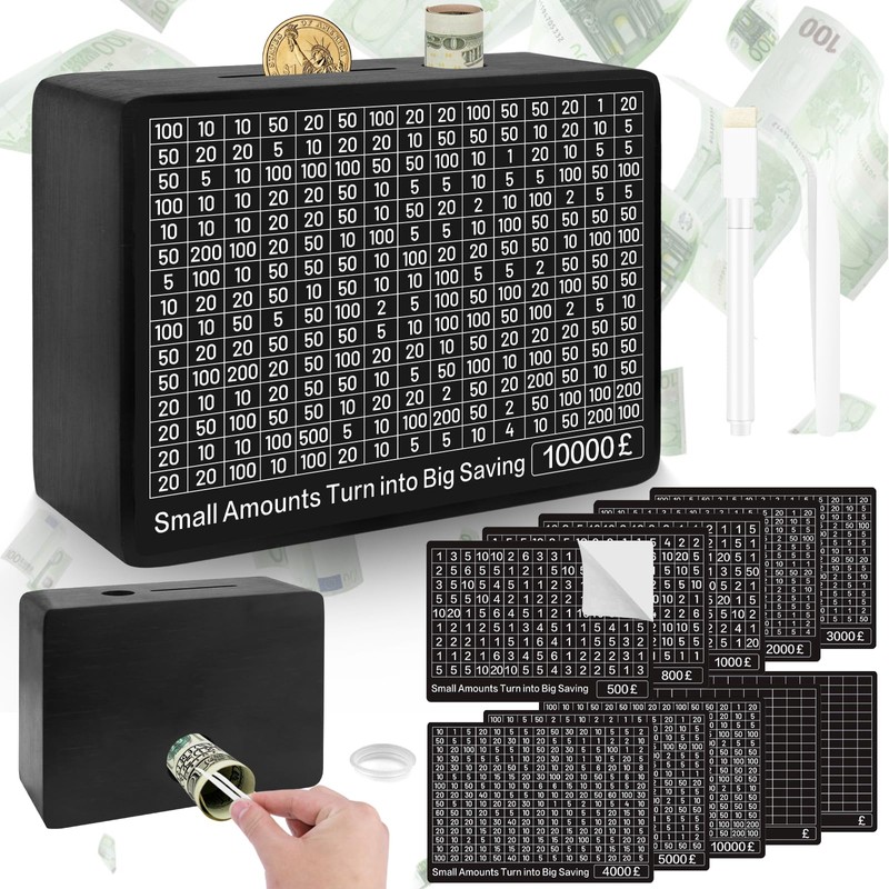 - 10,000 POUND LARGE KIDS MONEY BOX:Our children's money box allows you to deposit money in printed amounts from 1 to 75, up to 10,000 pounds. The kids money box not only keeps track of whether or not money is saved, but also the exact amount Simple and fun maths game for anyone. After reaching your savings goal, the person using it can open the reusable wooden deposit box and retrieve the money you have saved. It can then be erased to add new markers and start a new round of saving.
