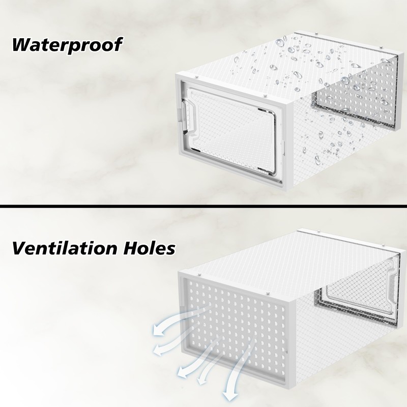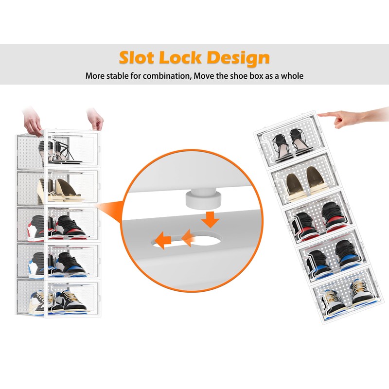 - 【Stackable Shoe Box】: The shoe box can be tightly connected up and down, you only need to lift the top one shoe box, then the whole row of shoe boxes can be removed together without falling. These stackable storage bins can be arranged to suit various spaces e.g. entryway, closet, under the bed, cabinet, drawers.