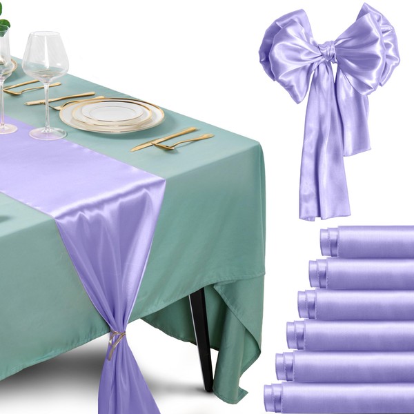 - PACKAGE CONTENT - 12 x Lavender Satin Table Runners, Size: 12 inch x 108 inch / 30cm x 275cm (W * L), bright table runner suitable for round table, rectangle table, dining table, coffee table, buffet table that can accommodate 8 -10 people. The wedding reception table runner can also be used as chair cover sashes or wall decorations.