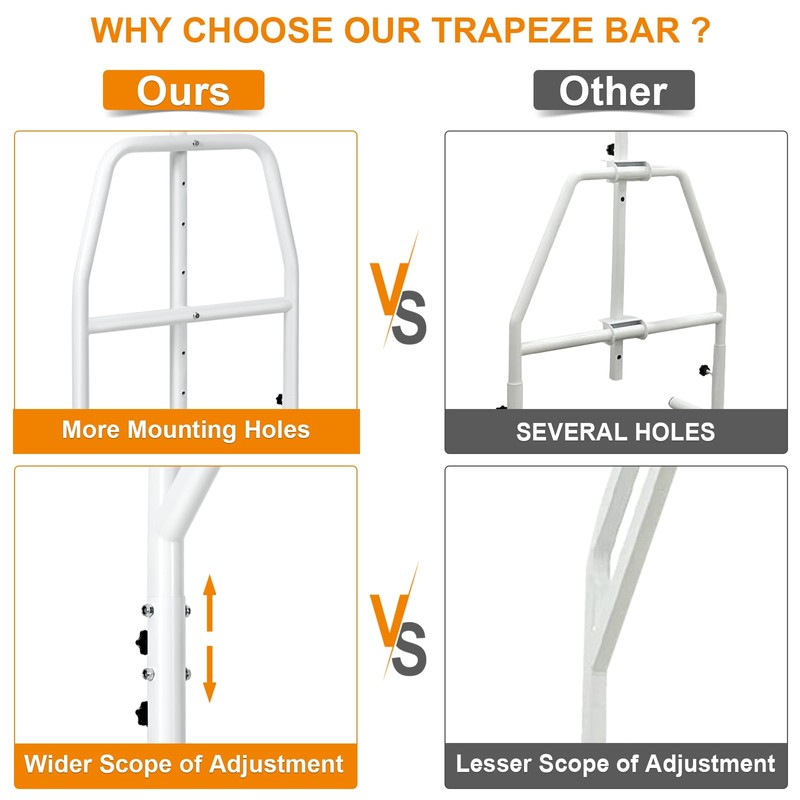 - Multiple Application: HomiShare trapeze bar is specially designed for people with mobility problems, such as elderly, patient. The trapeze bar provide them with safety, stability and portability as nurse when up and down bed. In addition, the bed pull up assist bar fit for most standard beds, home-care medical, or hospital beds, which can be used both horizontally and vertically.