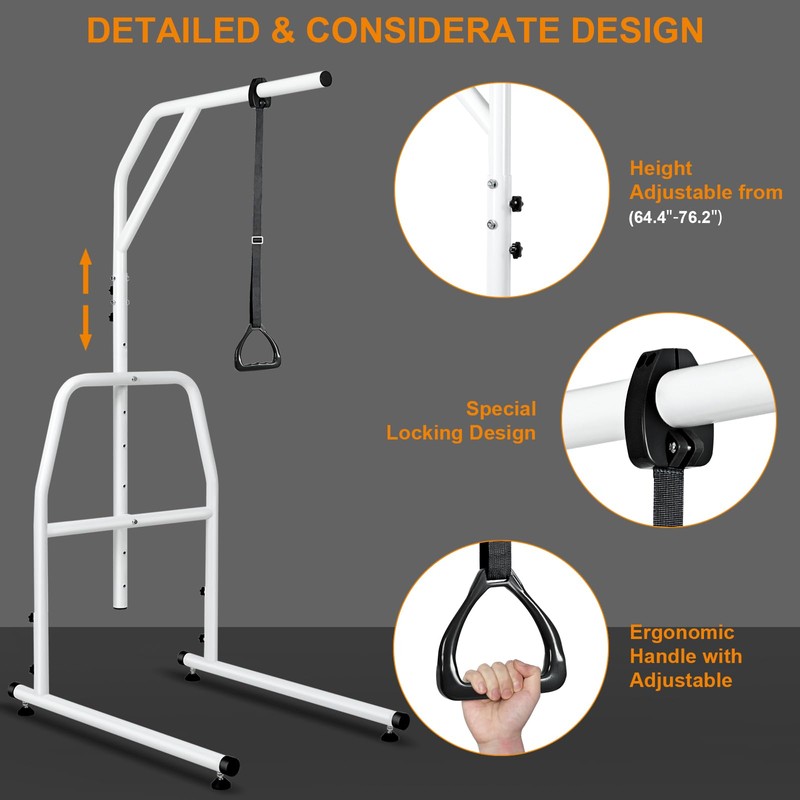 - Height Adjustable & Considerable Design: HomiShare trapeze bar can adjust the height of top railing and the angle of bottom rack. The rack height can be adjusted from 64.4" to 76.2". At the same time, the trapeze bar takes the latest handle design, this can help people choose the most comfortable position. And the buckle's length also can adjust for better grip. And you can also adjust the angle by using the black knob.