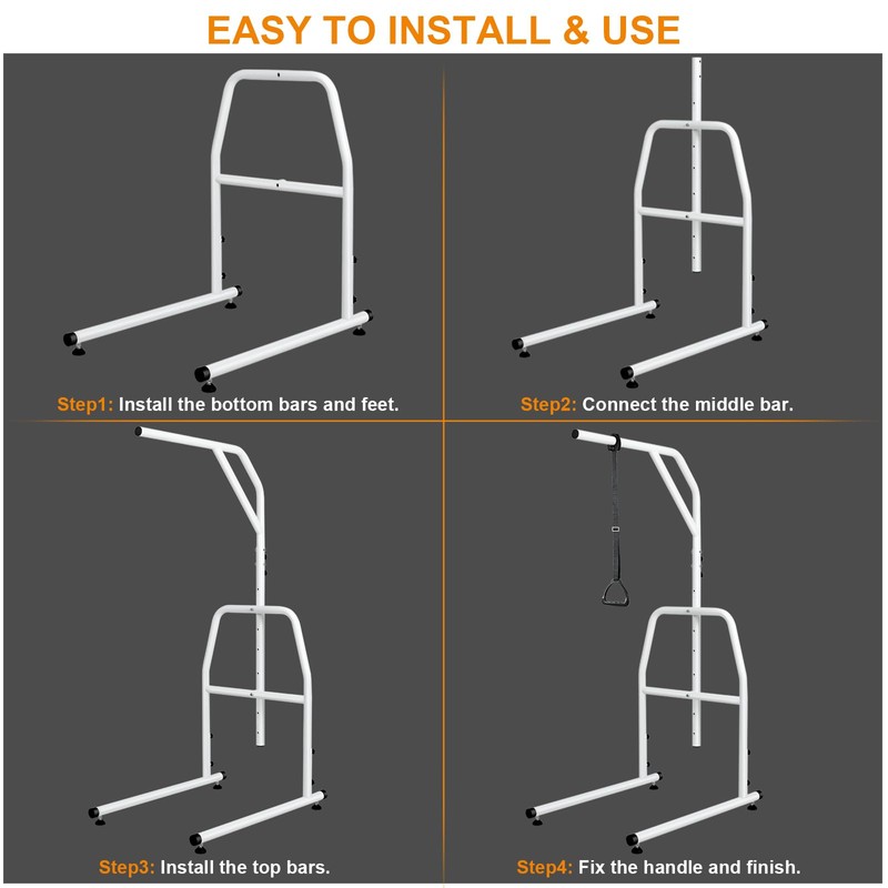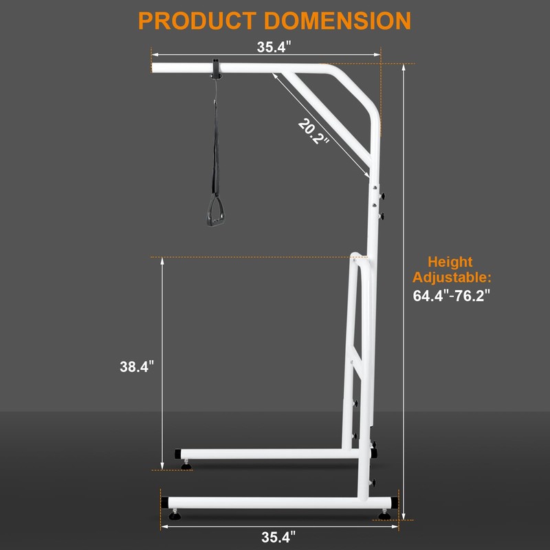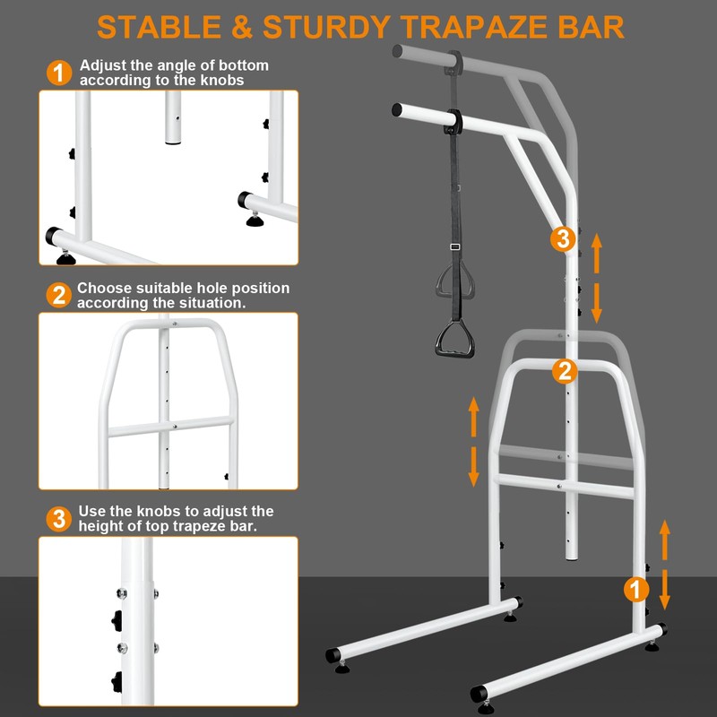 - Strong & Sturdy Structure: The body of our trapeze bar is supported heavy duty railings, which makes it stable structure. The bottom adopts four fixed feet to improve stability, you can adjust the height by rotating the feet to make the rack stand steadily on the floor. In addition, the triangle support make the structure more stronger. Strong structure makes our trapeze bar withstand up to 300lbs load capacity.
