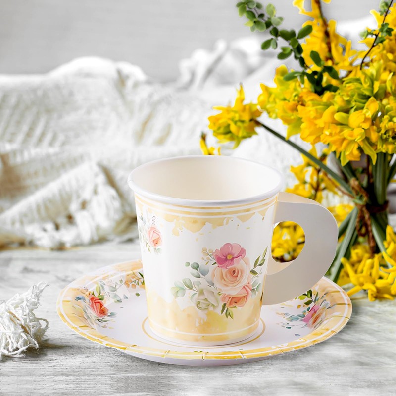 - Tea Party Set Serves 24 - Tea time party set includes 24 tea cups with handles and 24 saucer scalloped floral shaped paper plates. Coordinating designs pink with white design, yellow with floral pattern and purple with flowers.