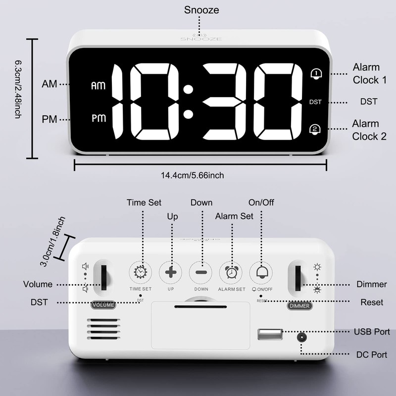 - DUAL ALARM WITH SNOOZE - With dual alarms, you can set two separate activation times. The 5 buttons on the back can be briefly pressed to turn off the alarm of the day, and the alarm can continue to sound the next day. By touching the "Snooze" button at the top of the alarm clock, the alarm clock can be delayed by 5 minutes