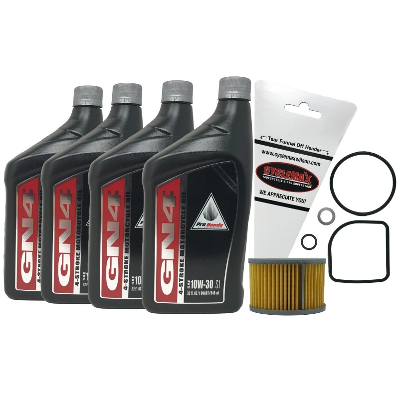 This Oil Change Kit Includes Four Quarts of Genuine Honda GN4 10W-30 Motor Oil, One Genuine 154A1-413-505 Honda OEM Oil Filter, One 12mm Crush Washer, and a Convenient Disposable Funnel