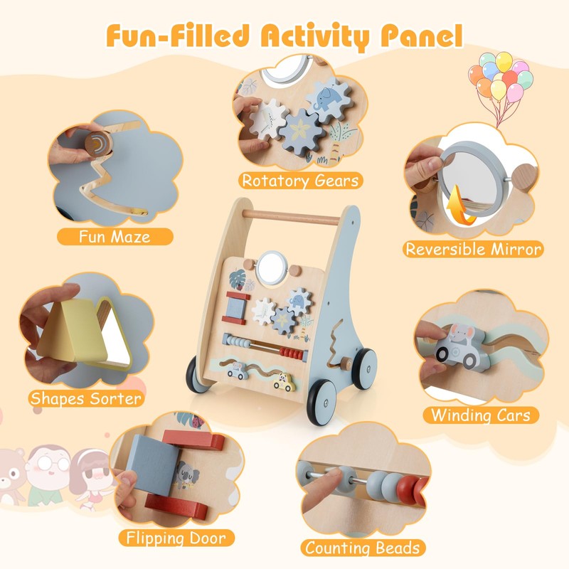 - 【All-in-1 Activity Center】Step into a world of joy with this HONEY JOY baby push walker! This adorable push walker is packed with engaging gadgets including fun maze, rotatory gears, reversible mirror, winding cars, counting beads, flipping door and shapes sorter, which are perfect for hours of giggles and learning.