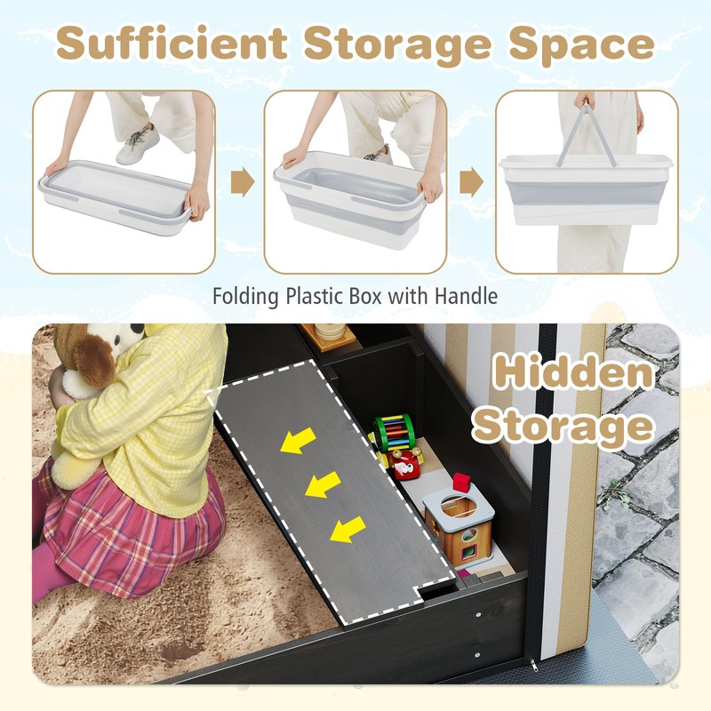 - Large Sand Playing Area: Imagine building a castle in 661 lbs of sand! This spacious sandbox-57 x 54 inches provides ample room for creative play. It includes 3 bench seats and a handy folding plastic box with a handle. And the hidden storage space under the seats is perfect for storing treasures or tools.