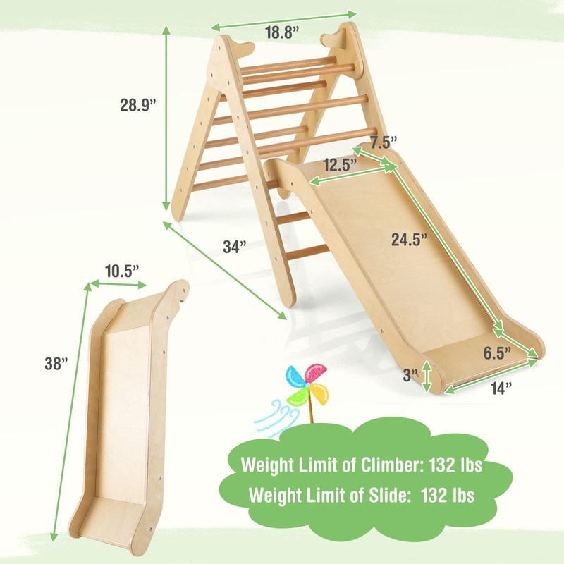 - 【Selected Wooden Material】Our triangle climber with slide is made of selected wooden materials, including safe beech wood bars and durable birch plywood, which is odorless, BPA-free, harmless for kids to play. In addition, all of our materials are also ASTM and CPSIA certified, enhancing its security.