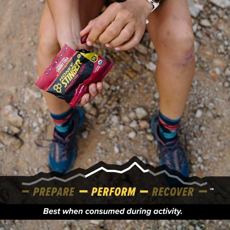 - DELICIOUS Naturally loaded with organic fruit flavors, Honey Stinger Caffeinated Energy Chews are bite-sized soft chews made using honey that won’t get stuck in your teeth and help to deliver quick, sustained energy on-the-go.