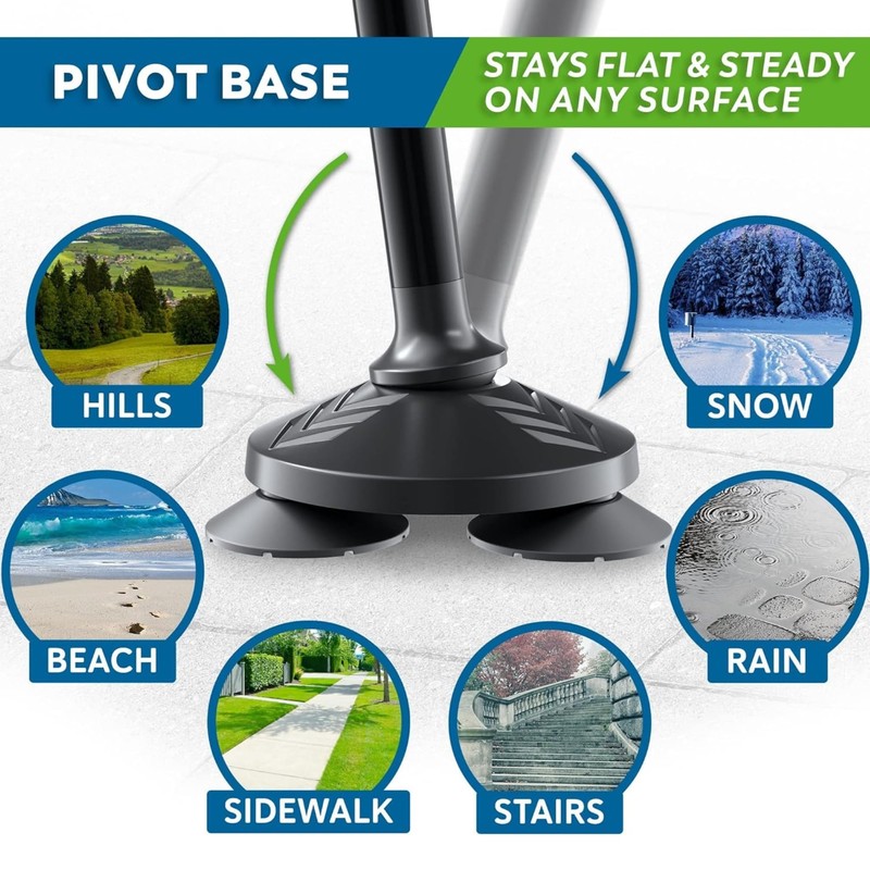 - Pivoting Tip: The base pivots to stay flat on almost any angled surface. Maximum ground contact on the non-scratch rubber base. The 4 pronged base acts like a quad cane