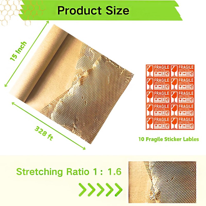 - Storage space saving: the size of our honeycomb paper roll before stretching is 15" width and 328" length. When you need to warp your items, just stretch it directly and the size of the honeycomb paper roll can be 14.5" width and 525" length for you. It's not just a huge mess. Thus, our honeycomb wrapping paper is saving storage space, easy to carry, and also, saving your transportation cost.