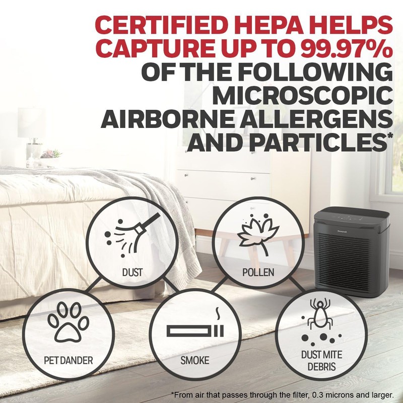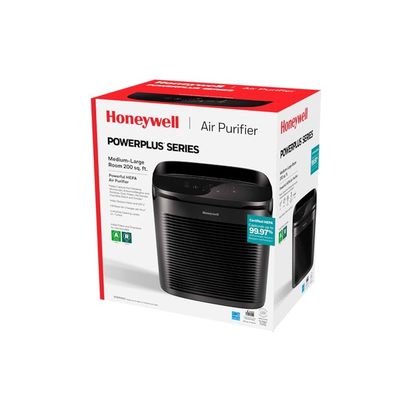 Experience exceptional air purification with the Honeywell PowerPlus HEPA Air Purifier. Ideal for home, bedroom, dorm room, or living room, this compact purifier circulates and filters room air 4.8x per hour** in Medium-Large Rooms up to 200 sq. ft. Great for homes with pets or allergen sufferers, this quiet purifier features 4 cleaning levels, a filter check/reset indicator, timers (2/4/8 hours), and night dimmer. ENERGY STAR certified for energy efficiency. Includes 1 R HEPA Filter (replace annually) capturing 99.97%* of microscopic allergens, and 1 A Pre-Filter (replace every 3 months) to capture larger particles and reduce odors. Optional Specialty Filters: Enhance purification with optional Honeywell Enhanced Odor & VOC T Filters, designed to tackle specific household odors from pets, kitchens, smoke, or VOCs from home renovations (sold separately) Disclaimers:* From the air that passes through the filter, 0.3 microns and larger. ** Based on 3rd party independent CADR testing for the smoke CADR value when operated at the highest level. Air circulation depends on many factors, such as room size and configuration. There is no guarantee that all of the air in a room will pass through the filter.