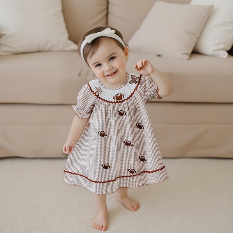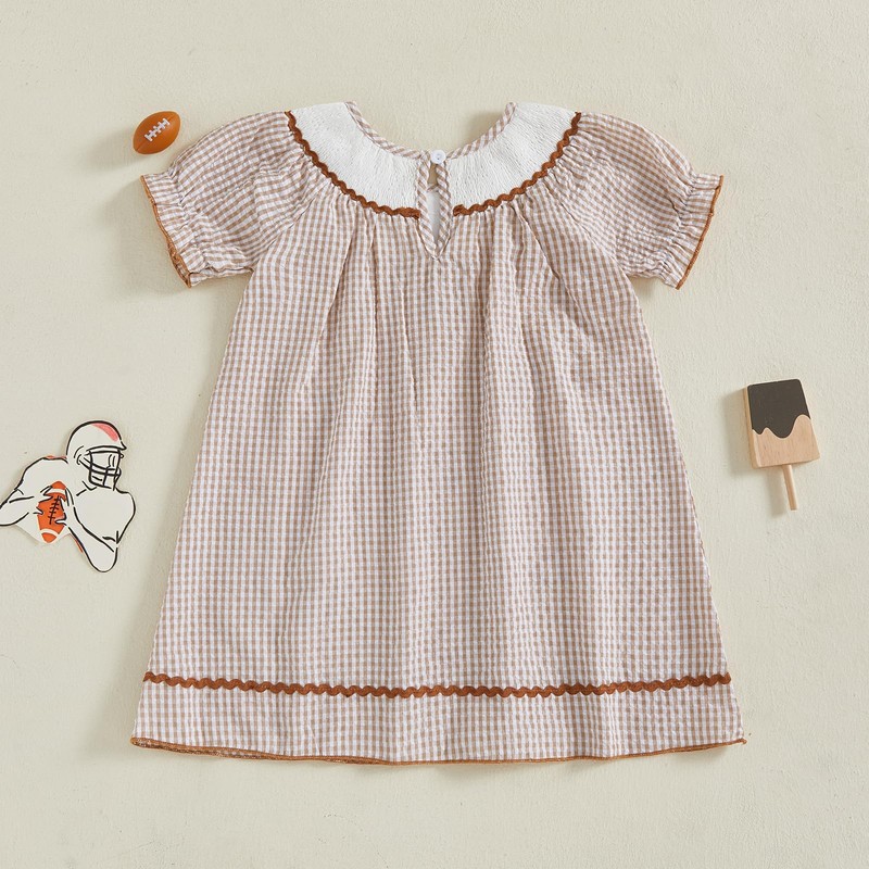 - Football Design - Kids girl dress and baby girl summer romper, short sleeve, smocked collar, plaid pattern, bow football rugby embroidery adding fashion and sporty look for this outfit