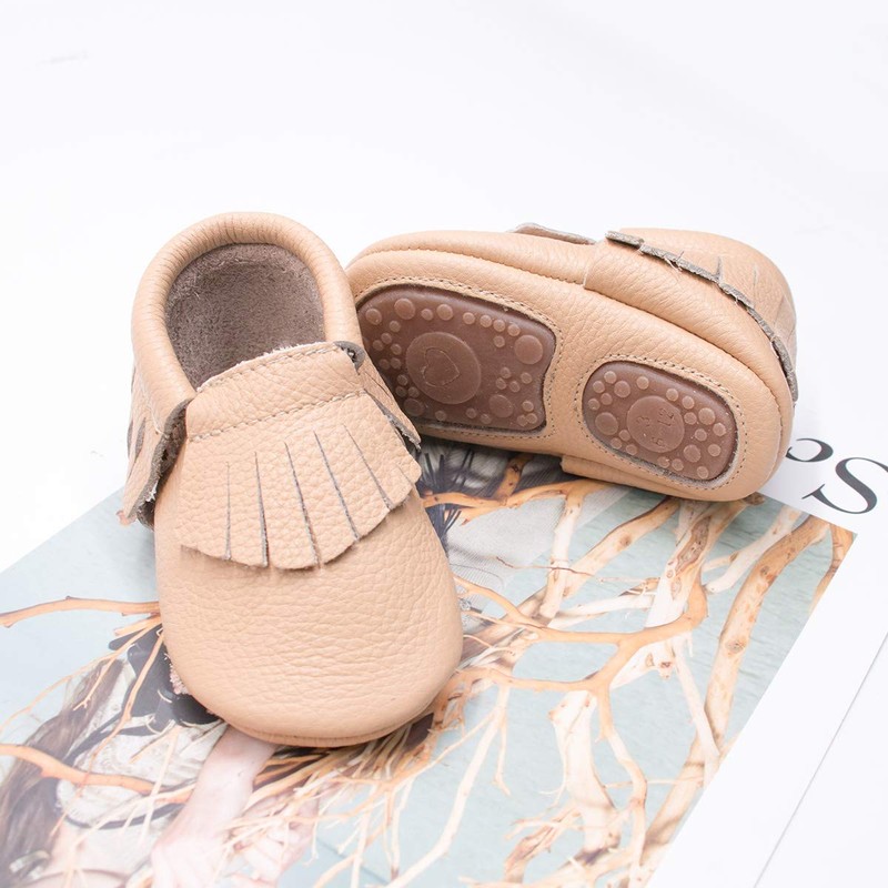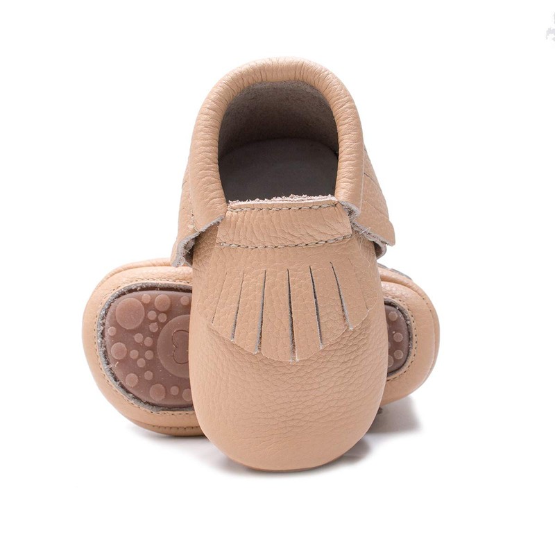 HONGTEYA Leather Baby Moccasins Hard Soled Tassel Crib Toddler Shoes for Boys and Girls (6-12 Months Infant, Light Khaki)