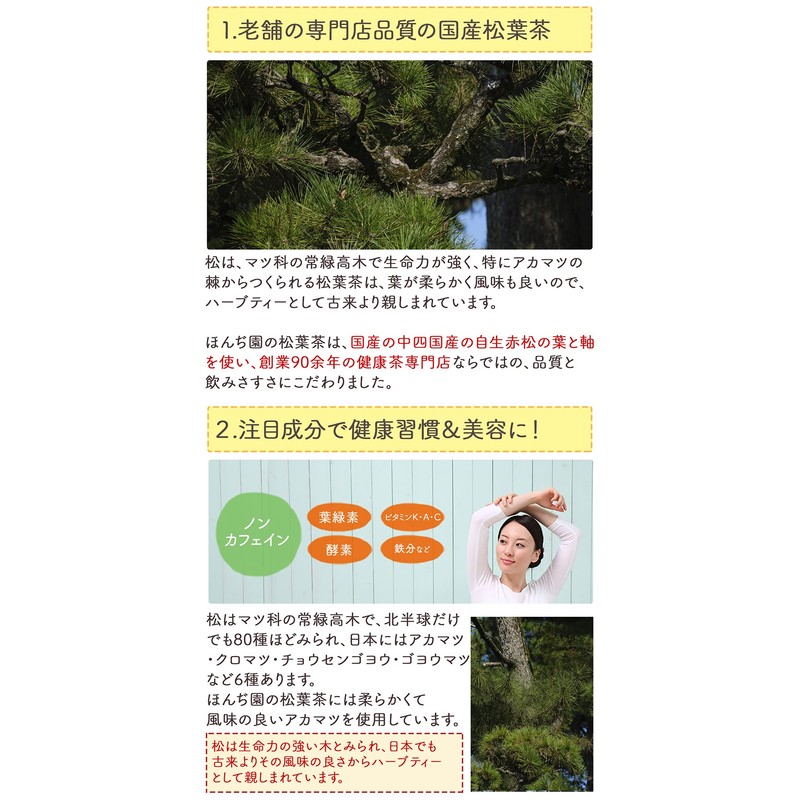 - Pine is an evergreen tree of the pine family with high vitality, especially made from spurs of acete, which has been known as an ancient herbal tea because the leaves are soft and flavorful. Honshien Matsuba Tea is made in Japan using homemade red pine leaves and shafts produced in Shikoku China, and has been dedicated to quality and drinking experience that is unique to a healthy tea specialty store for over 90 years