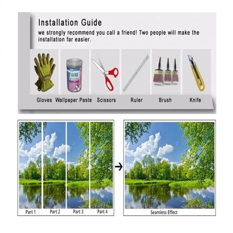 - Warm reminder: This mural cannot be torn off and pasted. You need to purchase additional (thick wallpaper adhesive) before installation. You can splice the mural into a complete pattern and install it in sequence. Then apply heavy wallpaper adhesive on the wall and paste the mural.