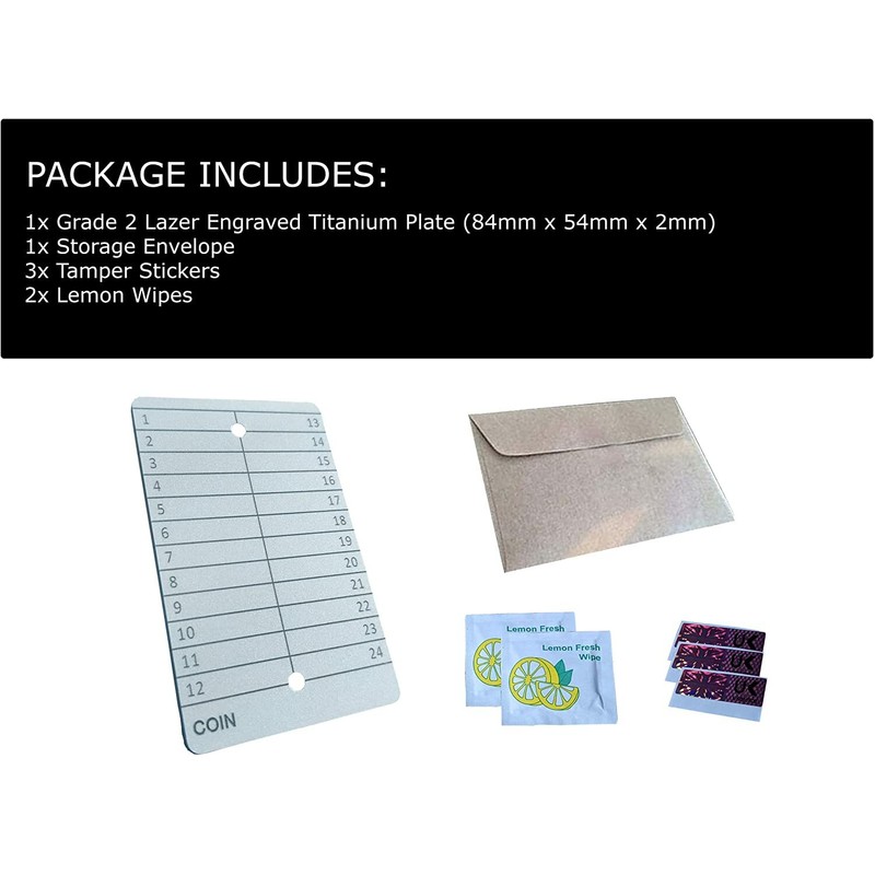 - BITCOIN TITANIUM WALLET & CRYPTO PASSWORD KEEPER WATERPROOF DESIGN:: Use it as your bitcoin titanium wallet, titanium seed plate, or crypto password keeper waterproof vault. This money storage crypto tool is compatible with any 24 word seed phrase metal layout.
