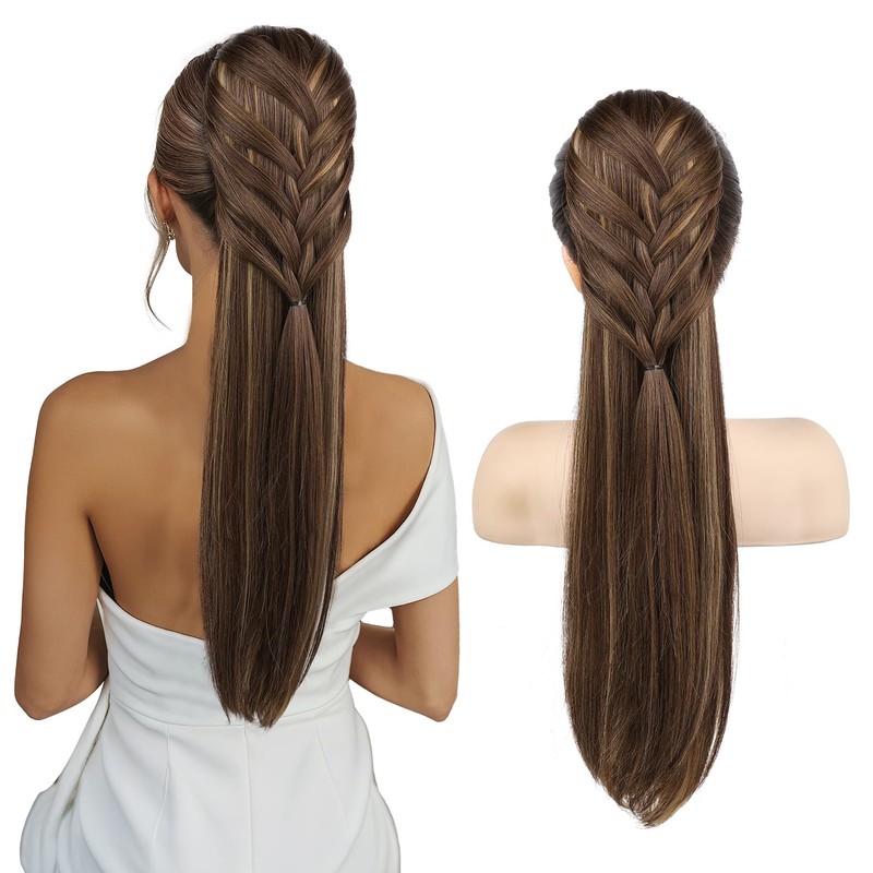 HOOJIH Ponytail Extension, 20 Inch Long Braid Drawstring Clip in on Ponytail Hair Extensions Synthetic Hairpiece for Women - Medium Golden Brown with Medium Natural Blonde
