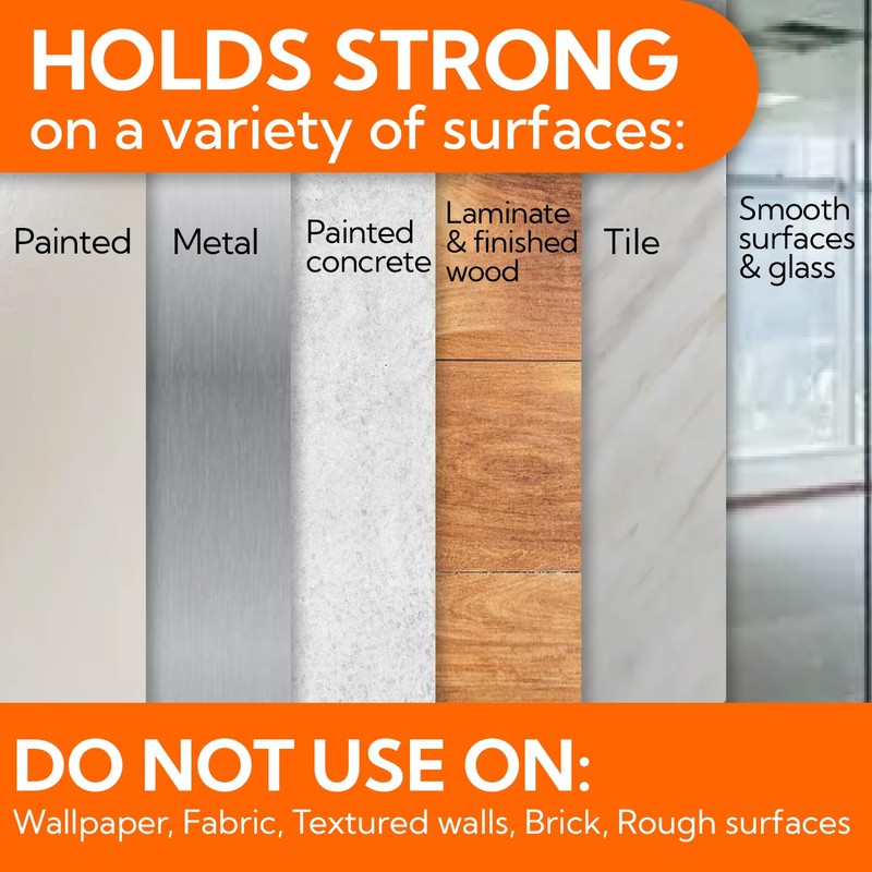- MULTI-SURFACE APPLICATION -- Works on painted walls, metal, painted concrete, laminate & finished wood, tile, glass and other smooth surfaces. No drilling or tools required. Avoid uneven, rough or porous surfaces, such as wallpaper or rough tile for maximum adhesion.