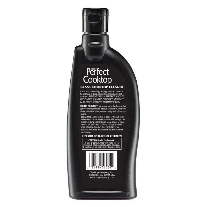 Hope's Perfect Cooktop offers a quick and easy cleaning solution recommended for all brands of glass ceramic smooth top ranges and cooktops. Created with a unique, fast-acting formula, this glass ceramic stove top cleaner deeply penetrates and gently loosens burnt deposits, grease, and grime so you can keep your cooktop clean and spotless with less wiping. Our glass ceramic cooktop cleaner will not scratch the surface of your stovetop and will leave it polished and shining like new. With a no-rinse formula, easily remove excess glass cooktop cleaner on your stovetop by using a dry towel, then buff it dry without the need of using an ounce of water. This electric stove top cleaner is formulated without harsh chemicals and is safe on the skin and in households with children and pets. Each bottle of the electric stove top cleaner contains 10.6 fluid ounces and is available in cost-effective multi-pack options. This flat top stove cleaner and polisher is recommended for all brands of glass ceramic smooth top ranges and cooktops such as Amana, General Electric, Maytag, Kitchen-Aid, Frigidaire, Kenmore, and Whirlpool. Hope's Perfect Cooktop is proudly made in the USA.
