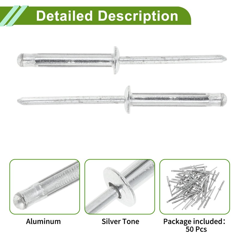 - Application:Product Name: Dome Head Tri-Fold Rivets; Material: Aluminum; Color: Silver Tone.