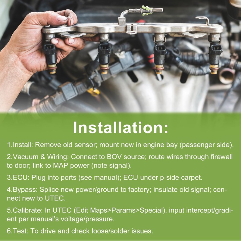 • Installation: 1.Install: Remove old sensor; mount new in engine bay (passenger side).2.Vacuum & Wiring: Connect to BOV source; route wires through firewall to door; link to MAP power (note signal).3.ECU: Plug into ports (see manual); ECU under p-side carpet.4.Bypass: Splice new power/ground to factory; insulate old signal; connect new to UTEC.5.Calibrate: In UTEC (Edit Maps>Params>Special), input intercept/gradient per manual’s voltage/pressure.6.Test: To drive and check loose/solder issues.