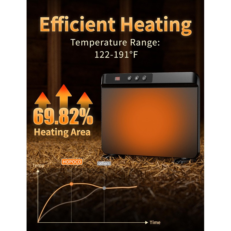 - Efficient Heating: The HOPOCO Chicken Coop Heater is equipped with a safer and more efficient heating panel, with a maximum temperature of up to 191°F. The adjustable temperature range is between 122°F and 191°F