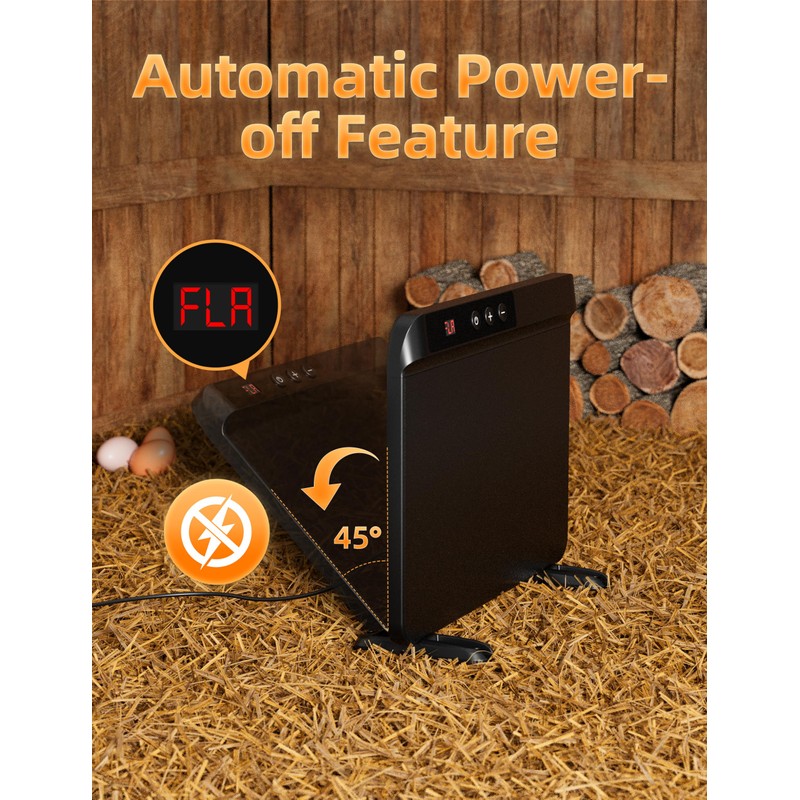 - Smart Safety: The HOPOCO Chicken Coop Heater is UL certified and features a built-in anti-tilt function. If the panel tilts or falls to 180°, the product will automatically shut off to protect your chicken coop and chickens