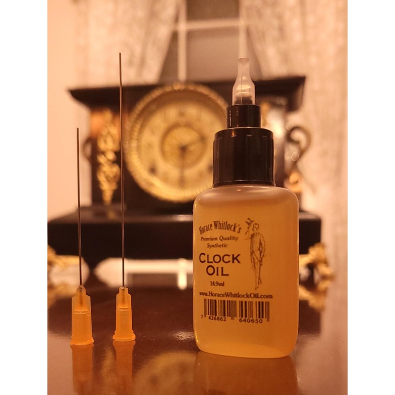Inside your package you will find the following items: (1)-15 ml Squeezable bottle of Horace Witlock's premium quality synthetic clock oil ( there is enough oil in this bottle to oil 50-75 clocks or more) (1) 2" inch and (1) 3"23 gauge blunt end needle (1) Luer lock bottle cap (1)-rubber tip needle end caps. Horace Whitlock's clock oil is a fully synthetic blend of oils, with the perfect properties for servicing and maintaining you antique, vintage and modern day mechanical clock. This clock oil has been perfectly blended for the best viscosity for all clocks. Horace Whitlock's clock oil will allow your clock to perform at peek performance for many years. This oil has been tested on over 3,000+ clocks in the past 10+ years. All Horace Whitlock oil's where designed for and sold to the professional clock repair shop and now has been available to the hobbies since the end of 2018. You wont find a better quality clock oil anywhere. This synthetic clock will not gum up, dry out or collect dust like most oils will. This clock oil is also safe on all plastics parts. Horace Whitlock Clock oil is specifically designed not to soften lacquer or varnishes and this oil has an extremely long shelve life. Our clock oil is now available in a squeezable bottle and comes with (1) 23 gauge Luer lock needles and a luer lock cap. This 23 gauge needle will allow the user to apply the perfect amount of oil where it is needed. Larger gauge needles (14-20 gauge) typically will deposit too much oil on the clocks movement, allowing for the oil to run down the side of the movement and drain out of the pivot. See the photo of the oil deposited on a backdrop. The smaller is from our 23 gauge needle and the larger drop is from a 20