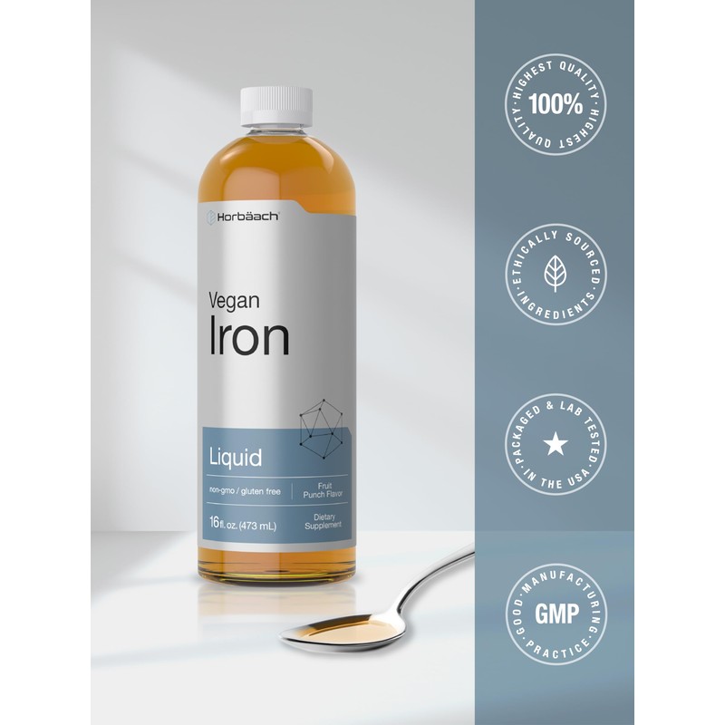 What is Iron?Iron is an important trace mineral in the body. It can be obtained from certain food sources such as leafy vegetables, meats and poultry. While Iron deficiency is not uncommon, an Iron supplement is the perfect way to add this essential mineral to your daily routine.Supplementing with Iron:Common forms of Iron now include pills, capsules, liquid drops, chewable tablets, gummies, extracts, softgels, and more. Looking for the ultimate source of Iron from a brand you can trust?Horbaach Vegan Iron:Horbaach Vegan Liquid Iron provides 18 mg of Iron per serving (as Ferric Glycinate), 100% of your daily value. Our convenient vegetarian formula delivers this essential mineral in a Fruit Punch Flavor you'll love! It's gluten free and non-GMO, made with no artificial color or sweetener, making it a popular choice of Iron for men and women everywhere.WARNING: If you are pregnant, nursing, taking any medications or have any medical condition, consult your doctor before use. If any adverse reactions occur, immediately stop using this product and consult your doctor. If seal under cap is damaged or missing, do not use. Store unopened container in a cool, dry place.WARNING: Accidental overdose of iron-containing products is a leading cause of fatal poisoning in children under 6. KEEP THIS PRODUCT OUT OF REACH OF CHILDREN. In case of accidental overdose, call a doctor or poison control center immediately.