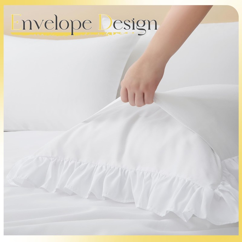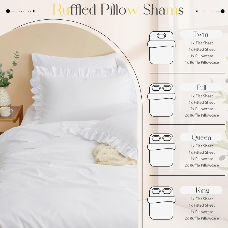 - [Farmhouse Aesthetic] - Our 6-piece queen sheet set including 1x flat sheet(102" x 90") + 1x fitted sheet(80" x 60") + 2x pillowcases(20" x 30") + 2 ruffled pillow covers(20" x 30"). Vintage-inspired ruffle trim with solid color design, creates elegant cottage atmosphere.