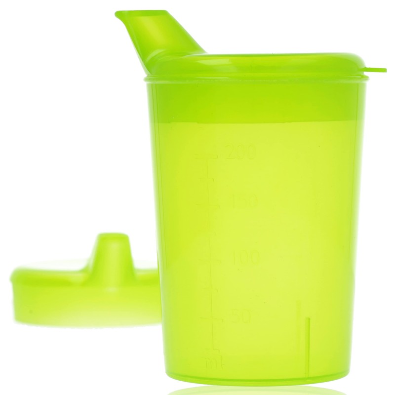 The lids differ in the size of the drinking opening diameter. A lid has an opening diameter of 4 mm and is ideal for leak-proof drinking of liquids such as water, tea, juice and the like. The second lid has a drinking opening with a diameter of 12 mm, which is also suitable for faster availability of liquids, as well as for the absorption of thicker foods such as thickened soup, vegetable porridge, fruit puree, etc. Please make sure that only cool or hand-warm drinks/food are served, as the cup has no insulation layer.