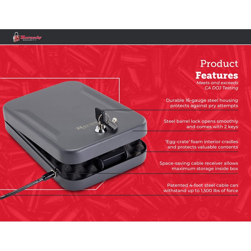 - Heavy and Sturdy C This Hornady safe is made from 16 gauge steel. Comes with a heavy duty 1500 lb. steel lock-down cable that attaches the portable safe to any stationary object, including a vehicle seat or heavy piece of furniture