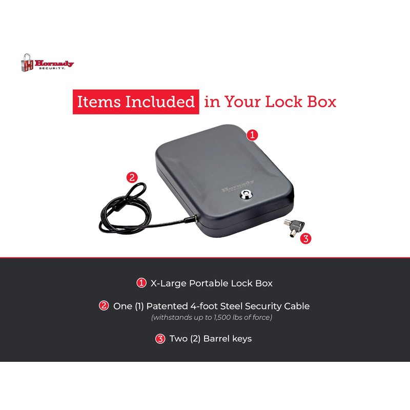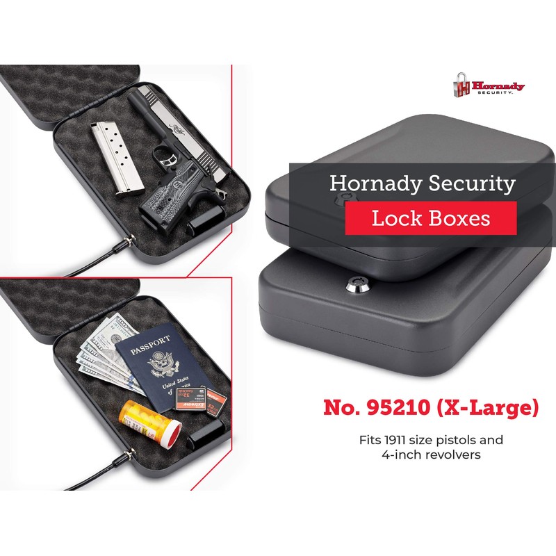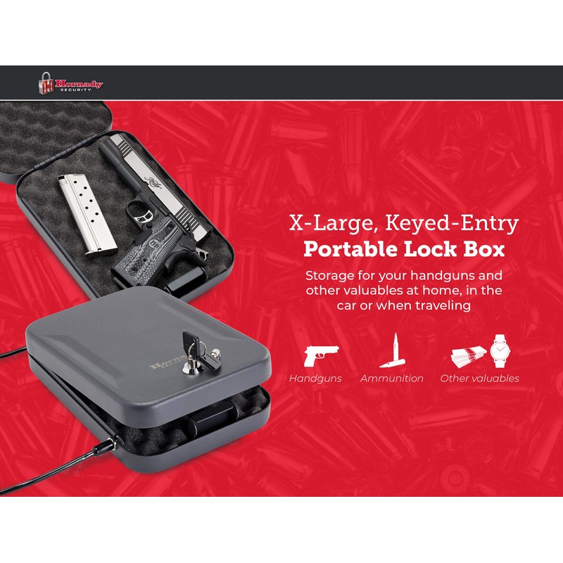 - Hornady Lock Box C Store your firearm and valuables with confidence. This extra large locked storage box provides a safe and secure place for your handguns and other valuables at home, in the car or when traveling