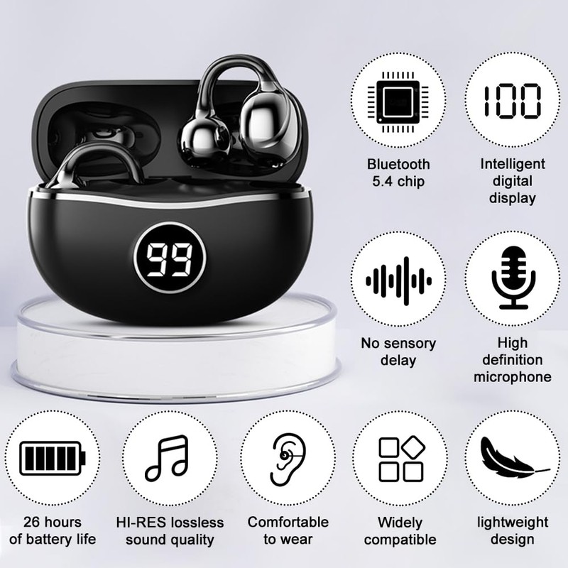 • OPEN EAR CLIP HEADPHONES - The Bluetooth headphones are designed with an ear clip that fits snugly to the ear for better wearing comfort. When worn for a long time, the ear contour is not too much loaded, very suitable for use in sports, outdoor activities and so on.
