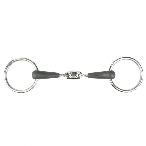 A very mild bit, the Horze Oval Link Loose Ring Snaffle Bit is a great choice for starting horses. Featuring an oval link double jointed mouthpiece, pressure is more evenly distributed across the tongue reducing the nutcracker effect. A rubber coating is gentle for sensitive mouths. It also encourages chewing and increases salivation, which relaxes the horse's jaw. The loose rings dissuade the horse from leaning on the rider's hands.