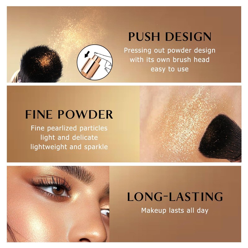 - Easy to Use: Comes with a brush that is easy to use, so you can apply it to the areas you want to brighten without the use of other tools, and you can quickly create a natural shimmering look without worrying about being late for work or a date. Note: When using for the first time, press the button a few more times until the powder comes out of the brush head