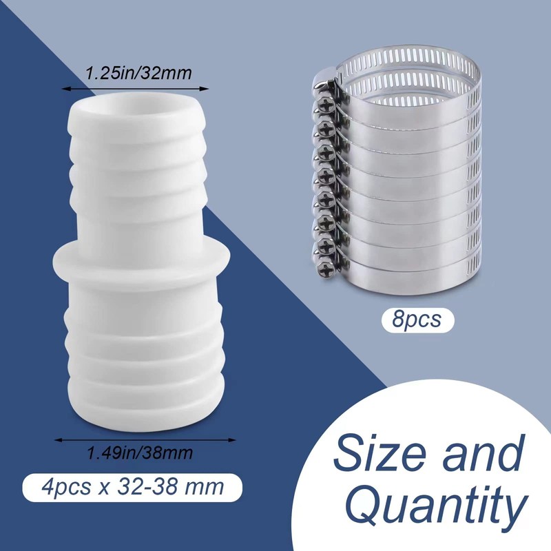 - Double hose nozzle pool accessories: 4 x pool hose connectors for hoses with adapter 32 mm to 38 mm + 8 stainless steel hose clamps.