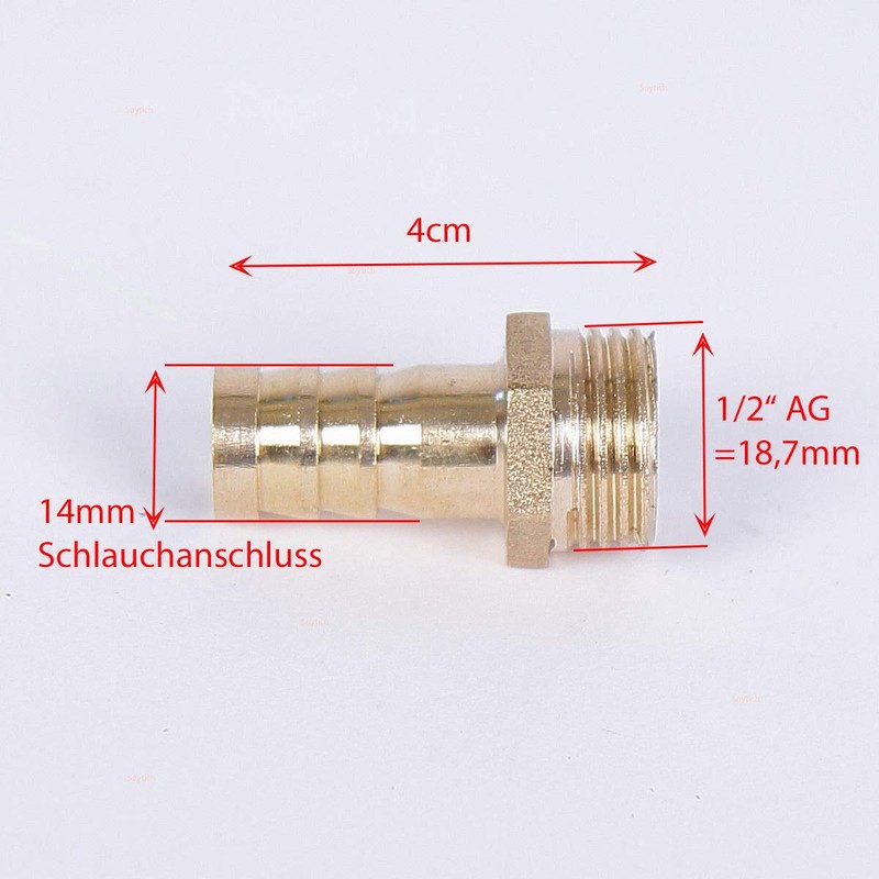- 1 x brass hose nozzle with 14 mm hose connection, on external thread 1/2 inch (21 mm).