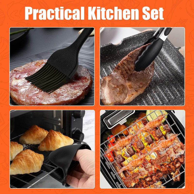 - Package contents: the package contains 2 stainless steel racks, 5 skewers, 1 silicone oil brush, 1 silicone tongs and 1 pair of silicone cases. These accessories offer more possibilities for your cooking and are a must have for the kitchen.