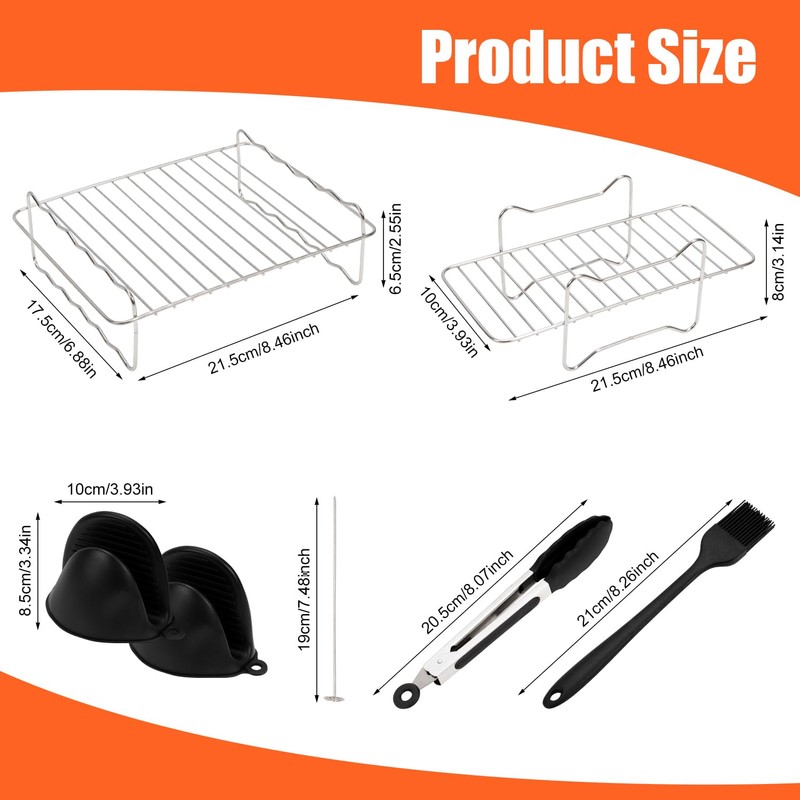 - Practical functions: the rack increases the capacity of the fryer and ensures even air circulation to cook food evenly and save time. There are 5 skewers on the gill rack, you can place some vegetable and meat skewers. With the oil brush, you can apply the barbecue seasoning. Silicone clips can be used for flipping or skewering food.
