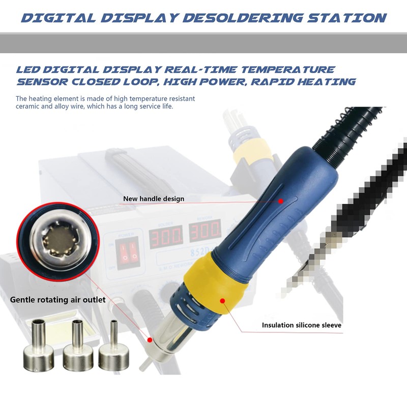 Purpose: Suitable for the desoldering of various components such as SOIC, CHIP, PLCC, QFP, BGA, etc. (especially suitable for the desoldering of mobile phone cables and cable holders). Used for heat shrinkage, drying, paint removal, debonding, thawing, preheating, welding, etc.