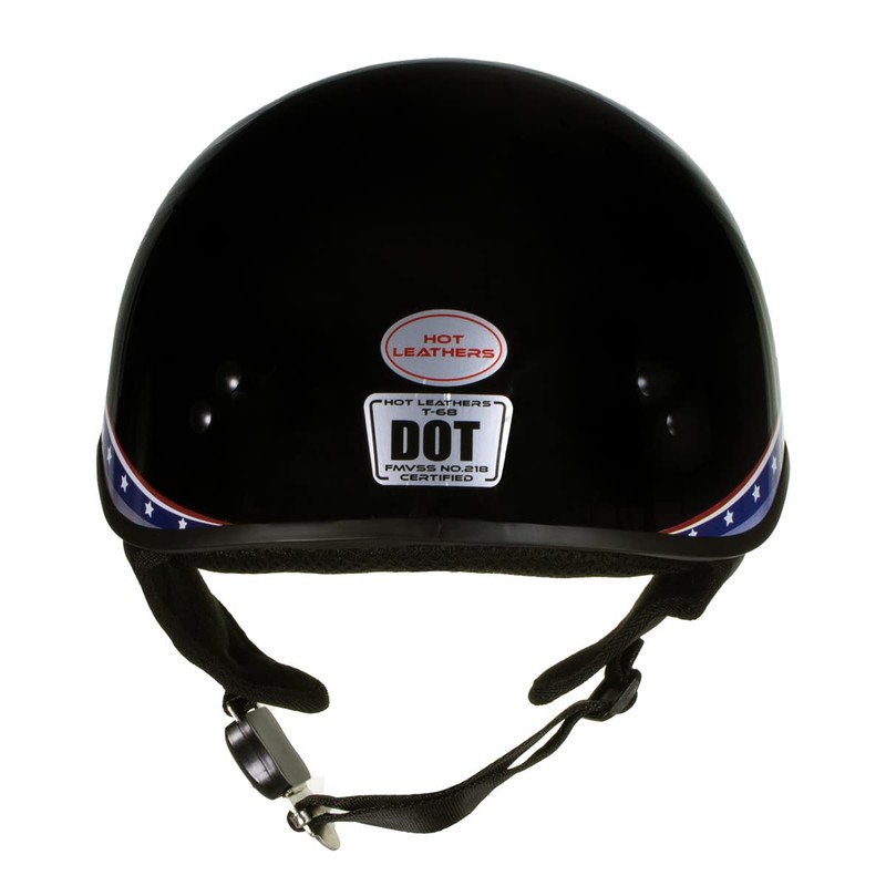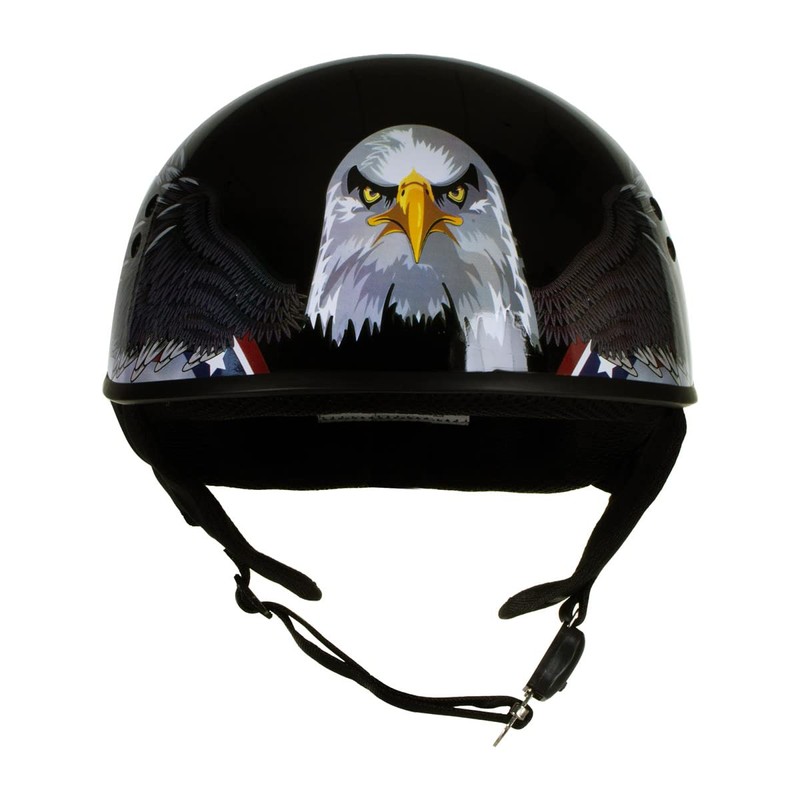 Hot Leathers T68 'Eagle' Black Advanced DOT Motorcycle Skull Cap Helmet Features Made of Thermo-Polymer Alloy Shell Construction Original Classic Design Impact Absorbent Comfort Liner Multi-Density EPS Liner Adjustable Nylon Chin Strap with Quick Release Buckle Included Storage Bag Less Bulky Then Normal Helmets with Maximum Protection Lightweight Helmet Around 2.30 lbs. (Weight Will Vary Upon Size) Meets or Exceeds DOT Approved Rating DOT Approved: Black Finish with Eagle Graphic half helmet with a composite shell is a type of protective gear that meets and exceeds the Department of Transportation FMVSS 218 safety standard. It’s made with strong light weight material. It’s designed to provide high level protection to the rider in the event of a crash. Our helmet’s also have a thick EPS (expanded polystyrene) inner lining for comfort and added protection. Safety: Wearing DOT approved protective gear, such as our motorcycle composite shell half helmet, is essential for safe riding practices. It’s important to choose gear that fits properly and meets the appropriate safety standards to ensure maximum protection. Our motorcycle helmet is designed with a comfortable adjustable Y-strap (chin strap) retention systems to keep the helmet secure, which is important during high-impact activities. Lightweight: Hot Leathers Half helmets styles are popular choice for Cruiser and Chopper motorcycle riders who want a comfortable and stylish helmet for their rides. Our cool motorcycle helmets are also a good choice for scooter riders, who want a lightweight and compact helmet that is easy to take on and off. Ventilation: An open face helmet leaves half of the face exposed, providing more ventilation and a wider range of vision. It’s a good choice for riders who want to feel more connected to the environment while they ride. Variation: The half helmets options are great for men and woman riders because it comes in a wide range of graphic designs and colors