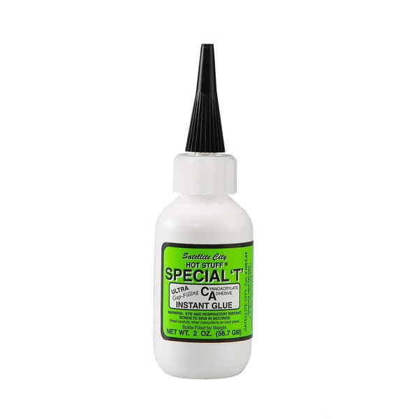 Special T THICK gap-filling CA glue (green label) has a viscosity (1150-1500) similar to honey. Special T works great when you use it to bond both porous and non-porous parts, and it can fill larger gaps than our Super T medium CA glue. It is best used for parts that are missing pieces or don’t fit very well together. You can bond the same materials as with our other CA glues- wood, metal rubber, nitrile, composites, many types of plastics- and Special T is effective even when a poor fit makes parts look impossible to bond. The gap- filling capability is very useful when there is a large chunk missing from a surface- filling that space with Special T can preserve the structural integrity, seal the area from moisture and contaminants, bond something to the exterior that would not fit otherwise, cover and protect jagged edges, and improve the look of the surface.