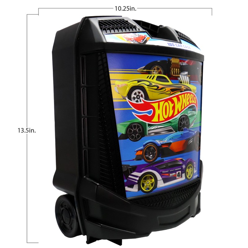 Collect and store up to 100 1/64th scale Hot Wheels vehicles The rolling wheels and telescoping handle are great for kids on the go! Assorted styles *Hot Wheels cars not included