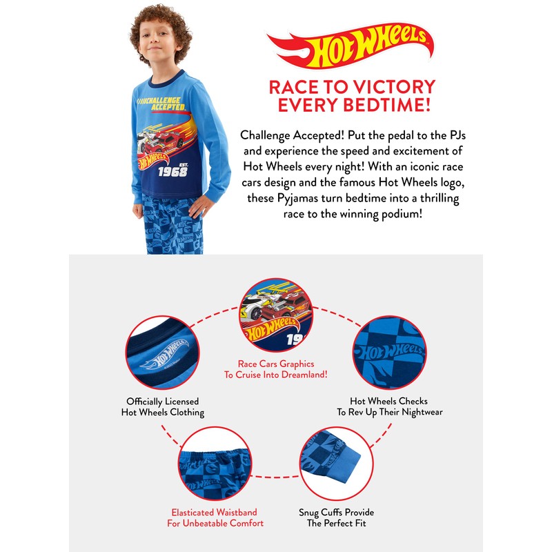 - Challenge accepted with our Hot Wheels pyjamas: Dive into dreams with the bold slogan "Challenge accepted" and the racing car print. Our Hot Wheels pyjamas for boys will surely boost their bed time and make them dream of the victory podium on the race track