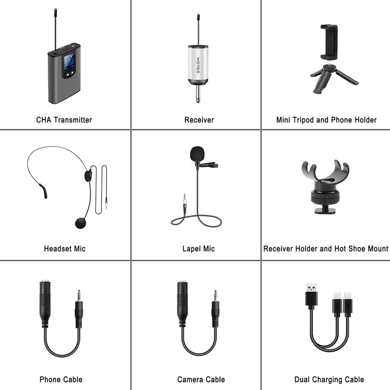 - What's in the box: One rechargeable receiver and one bodypack transmitters, one Headset mic and one Lapel mic for your different needs. Phone and Camera cable give it a wider range of applications. Dual charging cable, Hot shoe mount, phone holder all for your convenience. Beautiful box packaging, can be used as a gift, also very easy to store. Please feel free to contact the after-sales team for any questions.
