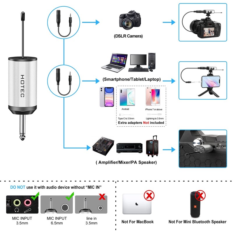 - Fully Compatible: This wireless receiver features a universal 1/4” plug, ensuring seamless integration with mixers, PA speakers, and karaoke machines equipped with a 1/4" MIC IN jack, perfect for voice amplification. Additionally, it's compatible with phones, laptops, and DSLR cameras (adaptor included), offering a versatile solution for recording purposes.