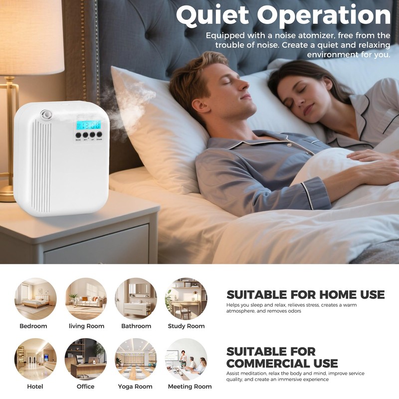 - 【Smart scent diffuser】Connect via Bluetooth to easily customize multiple advanced plans. Including operating date, specific time, atomization intensity, working time and rest time. Adjust the diffuser according to your preferences to create a personalized fragrance space.